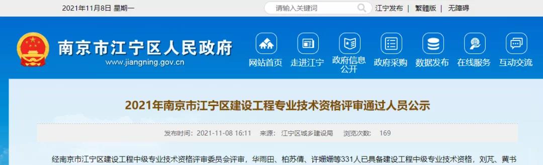 经南京市江宁区建设工程中级专业技术资格评审委员会评审,华雨田、柏苏倩、许姗姗等331人已具备建设工程中级专业技术资格,刘芃、黄书阳、端木颖佩等97人已具备建设工程初级专业技术资格。现将评审通过人员名单公示,有关单位和个人如对评审通过人员持有异议,可将意见反馈至南京市江宁区城乡建设局(南京市江宁区天元东路2999号),工作日联系电话:025—52706216,工作日联系时间:上午9:00—12:00,下午2:00—6:00。