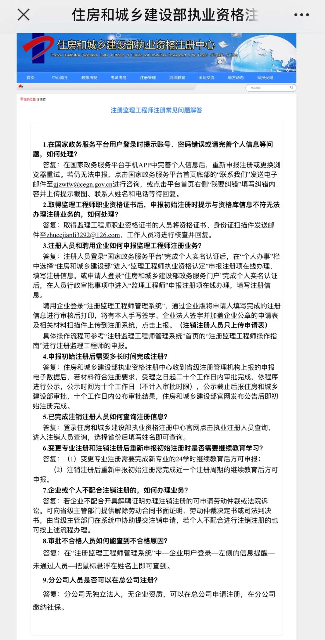 1、该截图内容来源于住房和城乡建设部执业资格注册中心发布的《注册监理工程师注册常见问题解答》一文,该文于2021年5月20日发布,全文共12条疑问解答,其中第11条,内容为“取得造价工程师和一级注册建造师资格是否可以代替中级职称?答复:不能代替中级职称。”。