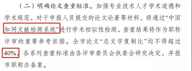 在《2021年南京市职称工作要点》中,第三大点第二条明确表示,论文查重标准。要通过“中国知网文献检测系统”进行查重,且“总文字复制比”不得超过40%