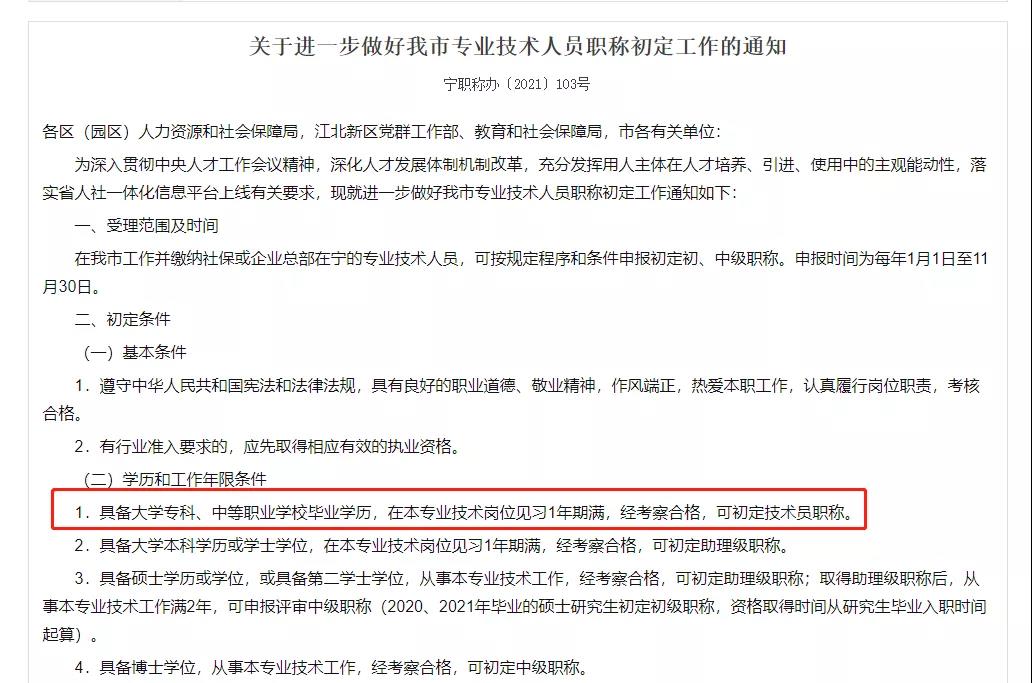 这不南京2022年初定工作通知已经发布,其中明确表明“具备大学专科、中等职业学校毕业学历,在本专业技术岗位见习1年期满,经考察合格,可初定技术员职称